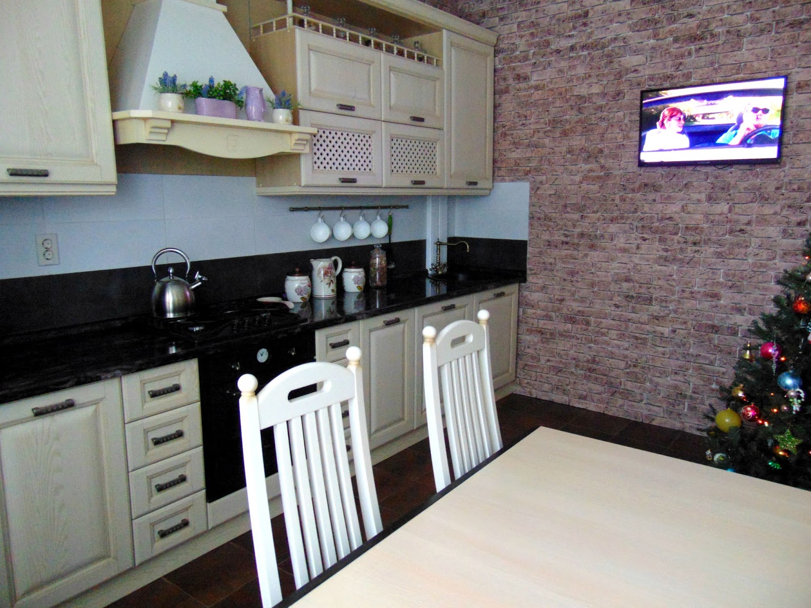 Кухня у меня из ясеня, стулья тоже,а вот стол просто шпонированный. Давно мечтаю его поменять на овальный,но пока мечта остаётся мечтой,а стоимость деревянных столов все более кусачей :) Телек как видите подключен без висящих проводов, видимых розеток и т.п- это положительная особенность наличия мужа электрика с руками из нужного места и головой на плечах :)) итак, камни. Вид кухни поменялся очень. Она стала более брутальный. А вот света стало меньше. И ещё не нравится место где фартук закончился,а камни начались. Наверно повешу туда ещё рейлинг,чтобы объединить эти две поверхности.